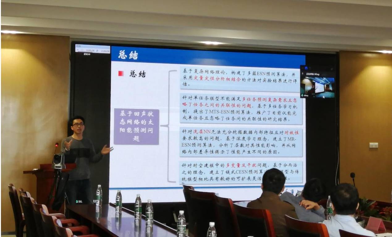 随后,伍洲教授分享了《回声状态网络(ESN)在时间序列预测上的应用》。回声神经网络是一种新型的循环神经网络(RNN),它的特点是隐藏层由大量的随机稀疏连接的节点组成,并且只需要输出连接权重值。伍洲教授介绍了该新型神经网络的算法原理,研究组对该网络应用在不同情况的太阳能预测工作,包括多簇回声状态网络的太阳能预测、多时间尺度回声状态网络的太阳能多任务预测、深度多隐藏层回声状态的太阳能预测以及基于链式回声状态网络的时空太阳能预测。