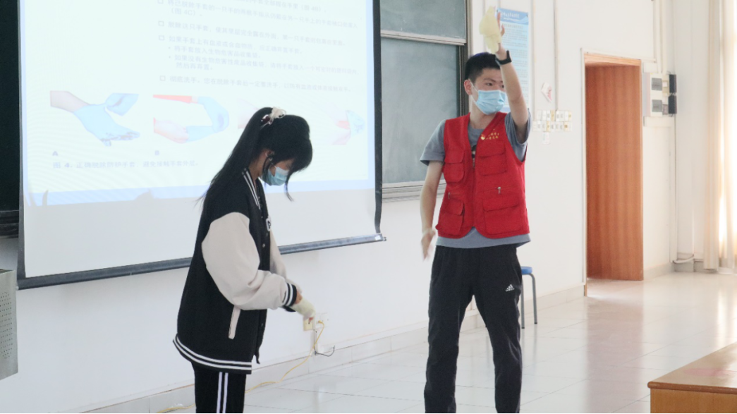 活动现场,主讲人结合我们的学生实际,通过浅显直白的语言与大家互动提问,并邀请同学教学示范“正确摘取急救手套”。更加深刻的加深同学们急救意识,同时为积极认真回答问题的同学送上急救小礼包一份。