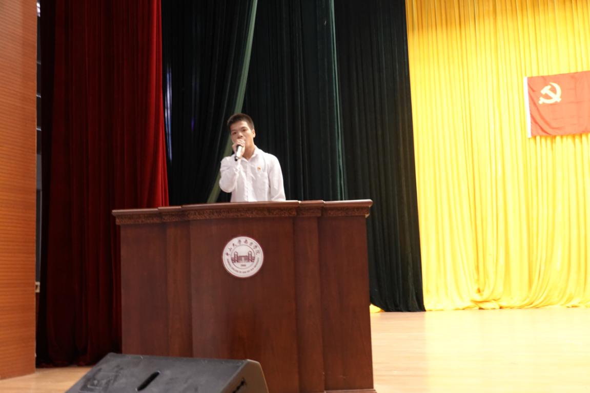 学生第四党支部学生党员代表周中武同志上台发言。他感情真挚地讲述了自己的入党历程,并提到他在党组织里面收获了珍贵的精神力量。最后,他由衷地表达了对党组织的爱护与感激之情,并且号召更多的师弟师妹们加入到党组织的大家庭。