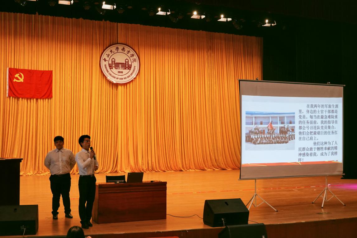 学生第一党支部宣传委员麦淳铭同志发简述了自己入党的心路历程,并且和大家分享了他在部队时的生活以及退伍后想在电气学院继续发出自己的余热。最后,他以木心名言结尾:“就算万丈深渊走下去也是前程万里。煎和熬,都会变成美味,加油,它也是。”得到了台下新生们的热情欢呼和雷鸣般的掌声。
