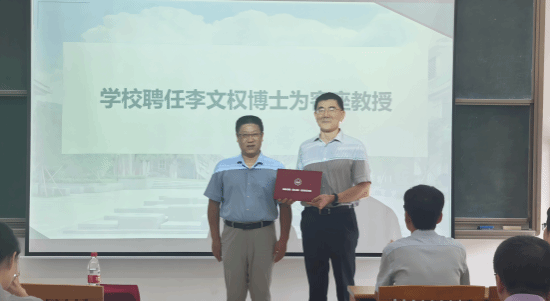 为了加强学院师资队伍建设,学校聘任李文权博士为客座教授,将对我院青年教师和学科发展进行指导。校长助理刘金成为李博士正式颁发了聘任证书。会后,李博士与院系领导进行了座谈,对学院的发展提出了建议。