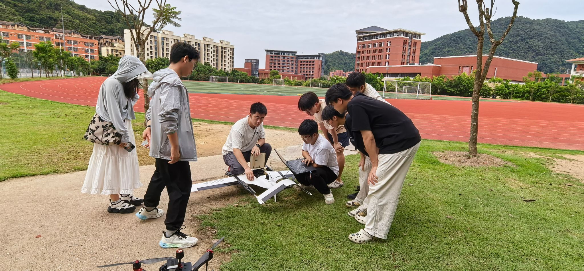 最引人注目的是V500固定垂直起降无人机的飞行演示,这款兼具固定翼和多旋翼优势的无人机在操场腾空而起,开始对校园进行三维实景地图构建。工程师们一边操作无人机飞行,一边向师生们讲解任务规划、数据采集、实时传输等关键技术。一位参与活动的学生表示:“通过今天的演示,我们直观地了解了无人机测绘的全流程,这对我们后续的专业学习很有帮助。”