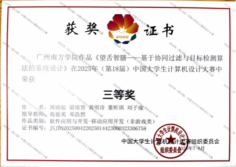 2025年7月27-31日,第18届中国大学生计算机设计大赛软件应用与开发全国总决赛在山东泰山学院圆满落下帷幕。本届赛事涵盖移动应用开发(非游戏类)、算法设计与应用、软件应用与开发专项赛、管理信息系统、Web应用与开发五大类别。经过层层选拔,全国31个省市458所高校的714项作品脱颖而出,进入到了全国总决赛,其中我院团队凭借优异表现,最终荣获“软件应用与开发-移动应用开发(非游戏类)”全国三等奖。