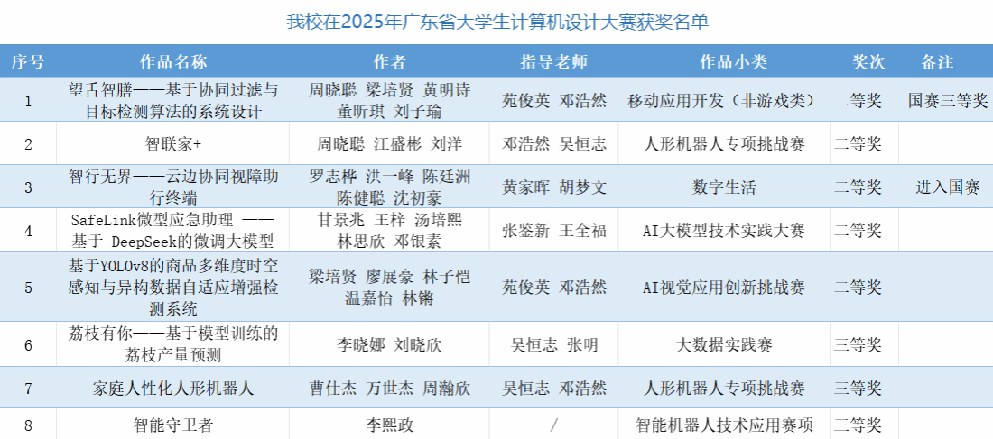 由广东省教育厅主办、广东外语外贸大学承办的2025年广东省大学生计算机设计大赛,经过严格的公开评审以及公示环节后圆满结束。在此次大赛中,我校师生展现出了扎实的专业技能和出色的创新能力,荣获省级二等奖5项、省级三等奖3项。经省赛遴选后,共2支队伍进入中2025年(第18届)中国大学生计算机设计大赛全国总决赛,其中“望舌智膳——基于协同过滤与目标检测算法的系统设计”荣获全国总决赛三等奖。