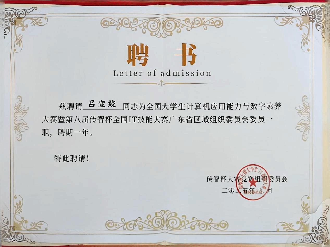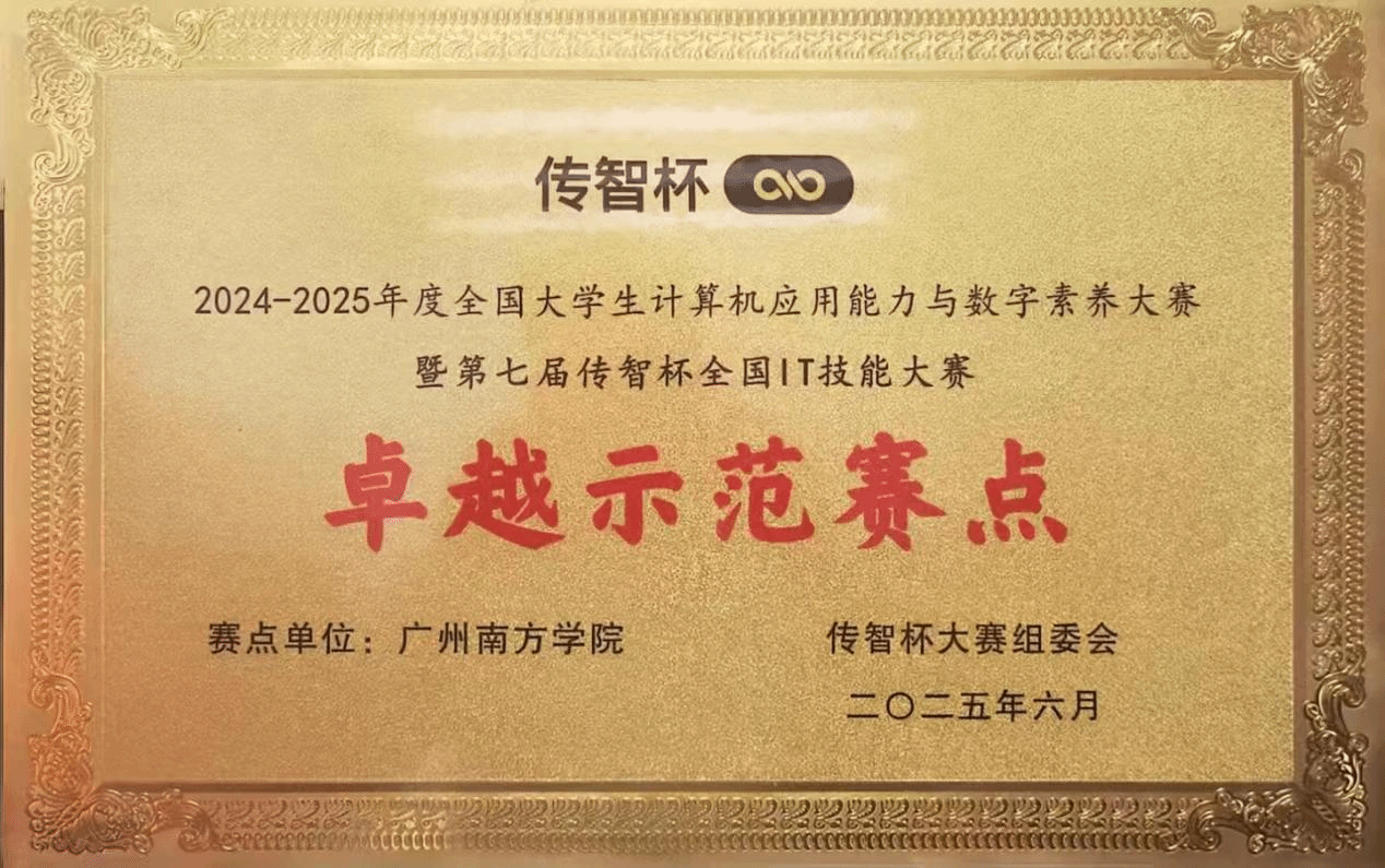 2025年9月20日,全国大学生计算机应用能力与数字素养大赛暨第八届传智杯全国IT技能大赛广东省赛事启动会在广州职业技术大学隆重举行。suncitygroup太阳集团被授予第七届赛事的“卓越示范赛点””称号,同时电气学院教师吕宣姣老师作为教师代表受聘为第八届广东省区域组织委员会委员。