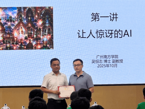 2025年10月14日,从化区流溪中学迎来了一场人工智能教育盛宴,由我院师生组成的科普教育实践团队应邀为高一学生带来了一堂别开生面的人工智能通识课。活动中,大数据与人工智能系副主任吴恒志老师被正式聘任为流溪中学科技副校长。电气学院2023级通信工程专业曹仕杰、2024级软件工程专业徐浩聪、2024级电子信息科学与技术专业孔泳铟、2024级计算机科学与技术专业康李浪等同学作为学生助教参加了此次活动。本次活动也是我院人工智能科普走进中小学校园的第一站。
