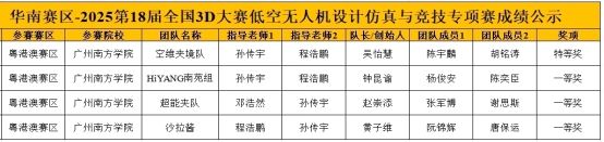 近日,2025年第18届全国3D大赛低空无人机设计仿真与竞技专项赛华南赛区选拔赛于华南农业大学圆满收官。我院程浩鹏、邓浩然、孙传宇老师指导的四支参赛队伍凭借卓越的综合素养与创新意识,在激烈的竞争中崭露头角,取得了优异成绩,荣获省级特等奖一项、一等奖三项,其中获特等奖的队伍获得了参加全国总决赛的资格。