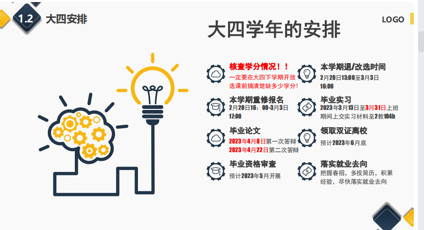 接着毕业班辅导员们为同学们梳理了大四学年的安排,提醒同学们做好计划,为自己的大生活画上圆满的句号。在落实就业去向方面,从考研深造、考公考编、创业就业以及参军入伍等方面给予同学们相应的建议和帮助,希望同学们能充分利用时间有计划地进行准备。