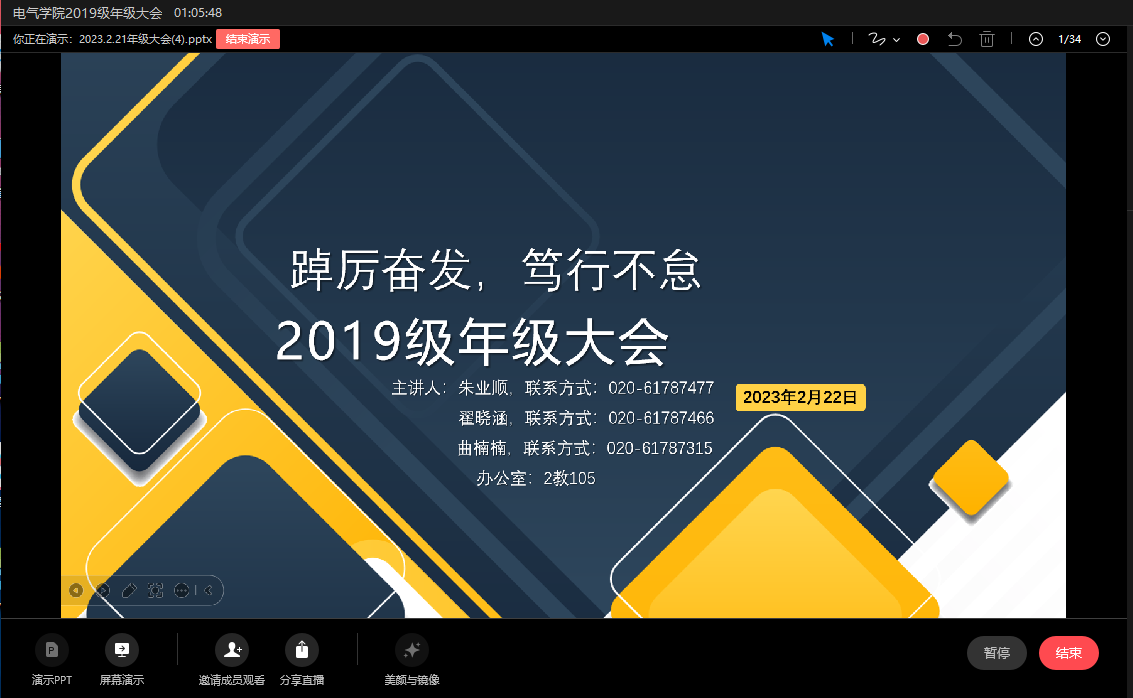 2023年2月22日20时,suncitygroup太阳集团2019级年级大会通过企业微信直播顺利召开。本次会议由2019级辅导员朱业顺老师、翟晓涵老师、曲楠楠老师主讲,2019级全体本科生参加。
