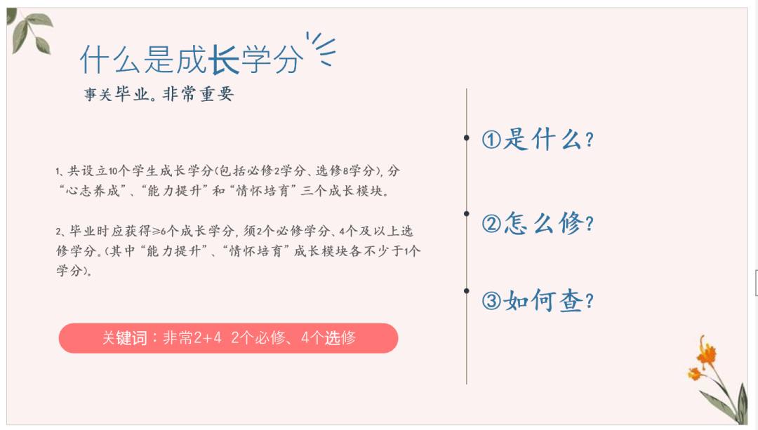 叮嘱同学们要多关注自己的成长学分情况,对于近期开展的活动存在不按要求上传材料、不重视、未及时上传材料的问题,需要加强重视,注意通知的要求以及时间节点,机不可失时不再来。