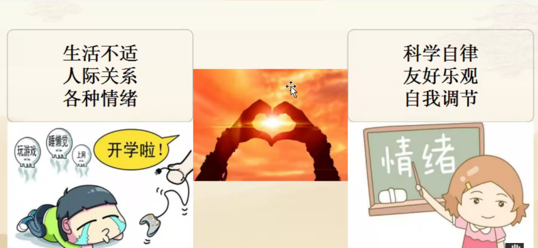 最后,孙老师为同学们做了返校前的心理辅导,并分享了一些心理调适小贴士。从“网课模式”切换到“校园模式”,同学们既期待又紧张,百感交集,难免会遇到学习生活不适、人际关系不适、各种情绪堆积等问题。遇到问题不要怕,孙老师希望同学们可以借助科学的生活管理,尽快调整作息;借助积极体验、放松冥想、听音乐、适度运动等方式,进行心理赋能,赶走焦虑、烦躁、紧张等消极情绪。不论是生活上,还是学习状态上,都要做到友好乐观、科学自律的状态,做好新的计划,勇敢迎接新生活。