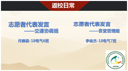 期间,孙老师还专门邀请了在学校做志愿者的交通协调组代表和食堂管理组代表,对交通、食堂相关注意事项进行了介绍和答疑,他们分别是来自18电气6班的许鹏森同学和18电气7班的李俊杰同学。