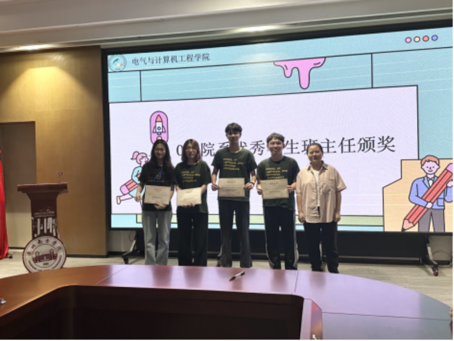 唐玉婷老师给荣获2023-2024年度院系优秀学生班主任的学班颁奖。