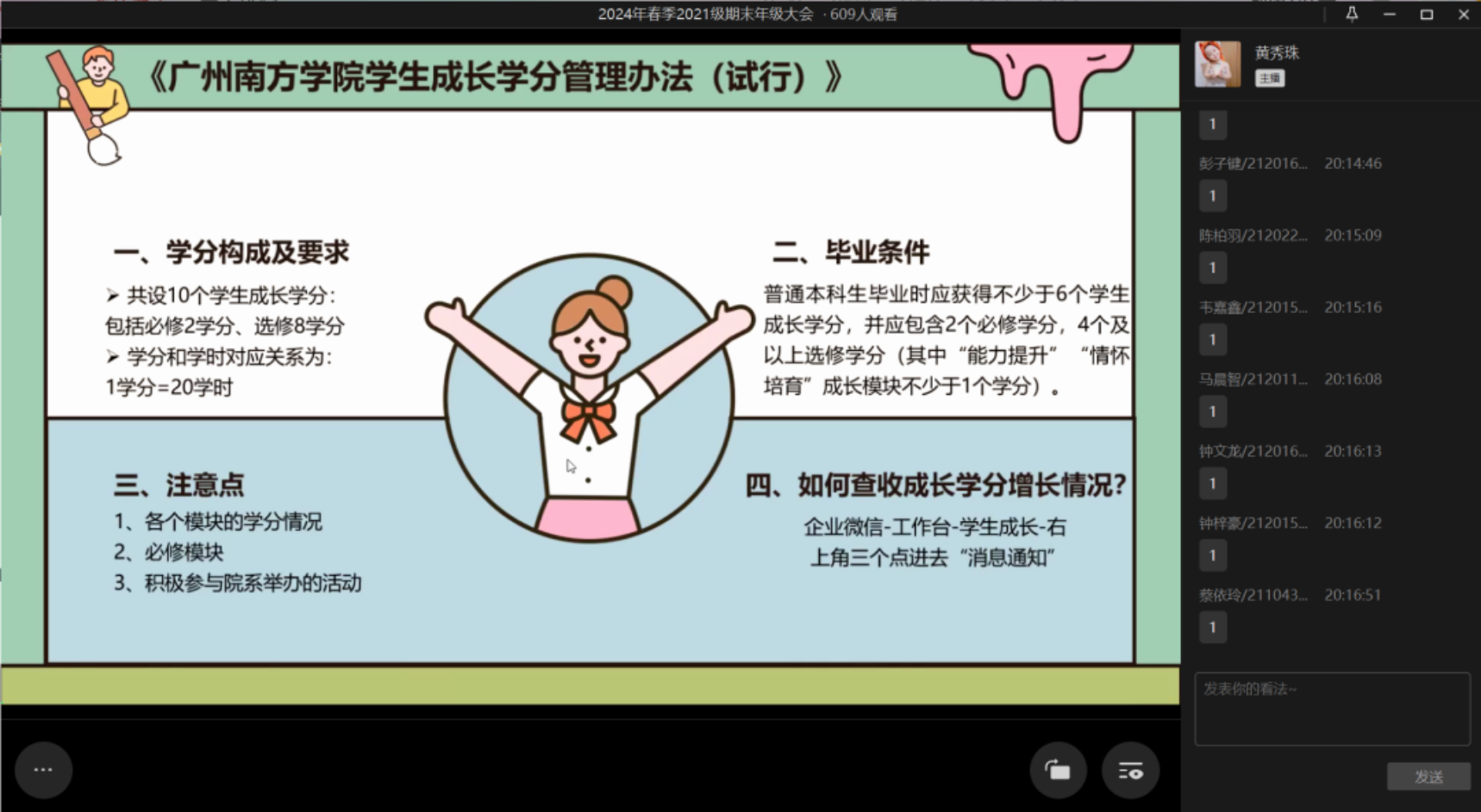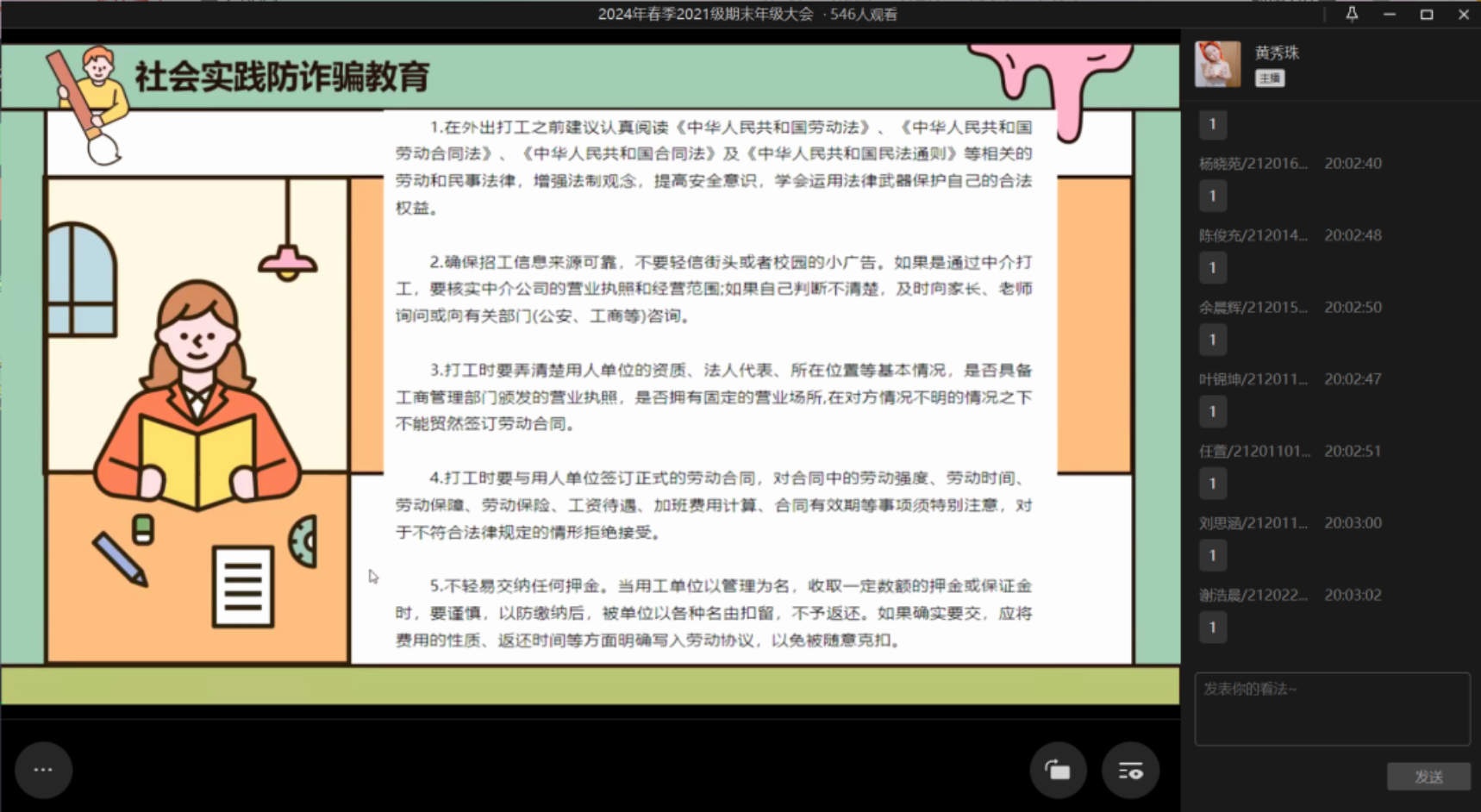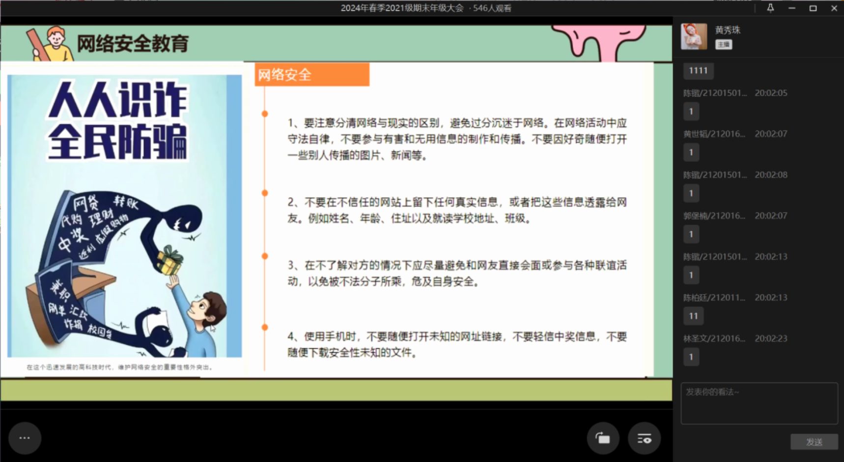 首先,邓惠君老师向同学们强调了离校安全的注意事项,要整理好个人物品,带走贵重东西,离开宿舍前要切断电源,关闭水源,并及时填写离校去向表,告知家人和辅导员去向以及主动报平安。同时邓惠君老师强调同学们一定要注意网络安全,提高自己的防诈骗意识,并且随着大四实习期的到来,也要加强社会实践防诈骗意识。