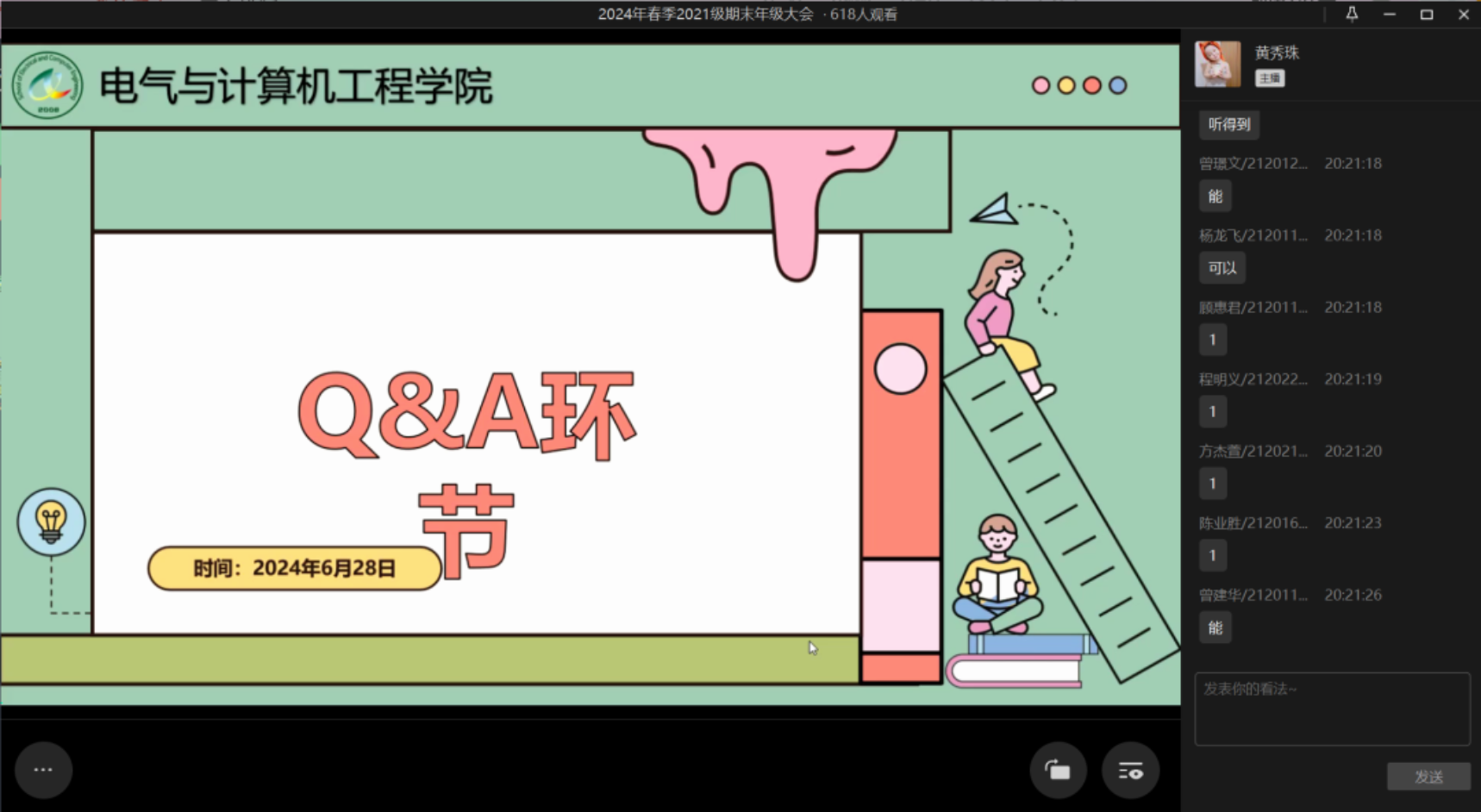 在年级大会的最后,老师们还设置了一个特别环节:Q&A环节。王老师和黄老师在线给同学们就生活、学习、实习等方面问题进行了解答,同学们不仅对相关问题有了清楚的了解,也更加明确了未来发展的方向。至此,本次电气学院2021级春季学期期末大会圆满结束。