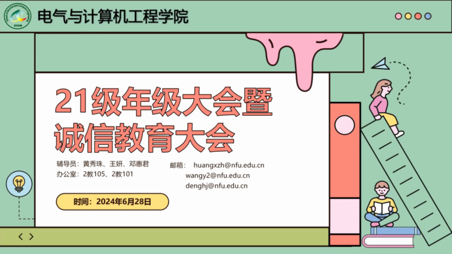 时光如箭,岁月如梭,转眼间大三下学期的校园生活也即将结束,为了让大家更好合理安排规划学业与职业,明确未来发展方向,同时树立同学们诚信考试理念,了解暑假期间其他注意事项。2024年6月27日20:00,电气学院2021级召开2024年春季学期期末年级大会暨诚信考试教育大会,本次会议由2021级辅导员黄秀珠、王妍、邓惠君老师共同主持,电气学院2021级全体学生参加。