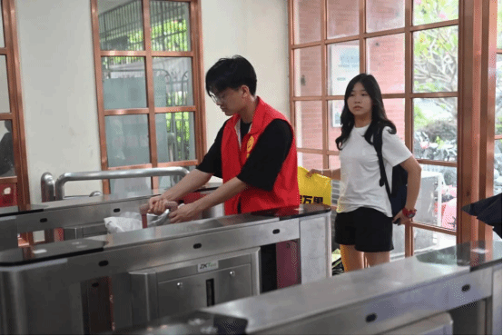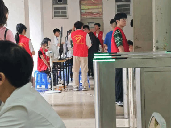 在校园内,一群身着鲜艳志愿服的志愿者在熙熙攘攘的人群中忙碌穿梭,形成了一道亮丽的风景线。他们热情洋溢,细心周到地引导新生们办理入学手续,规范有序地帮助他们运送行李,确保每位新生都能顺利、无忧地完成报到流程。